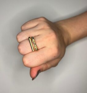 Com design moderno e marcante, o anel dourado modelo degraus traz elegância em camadas.